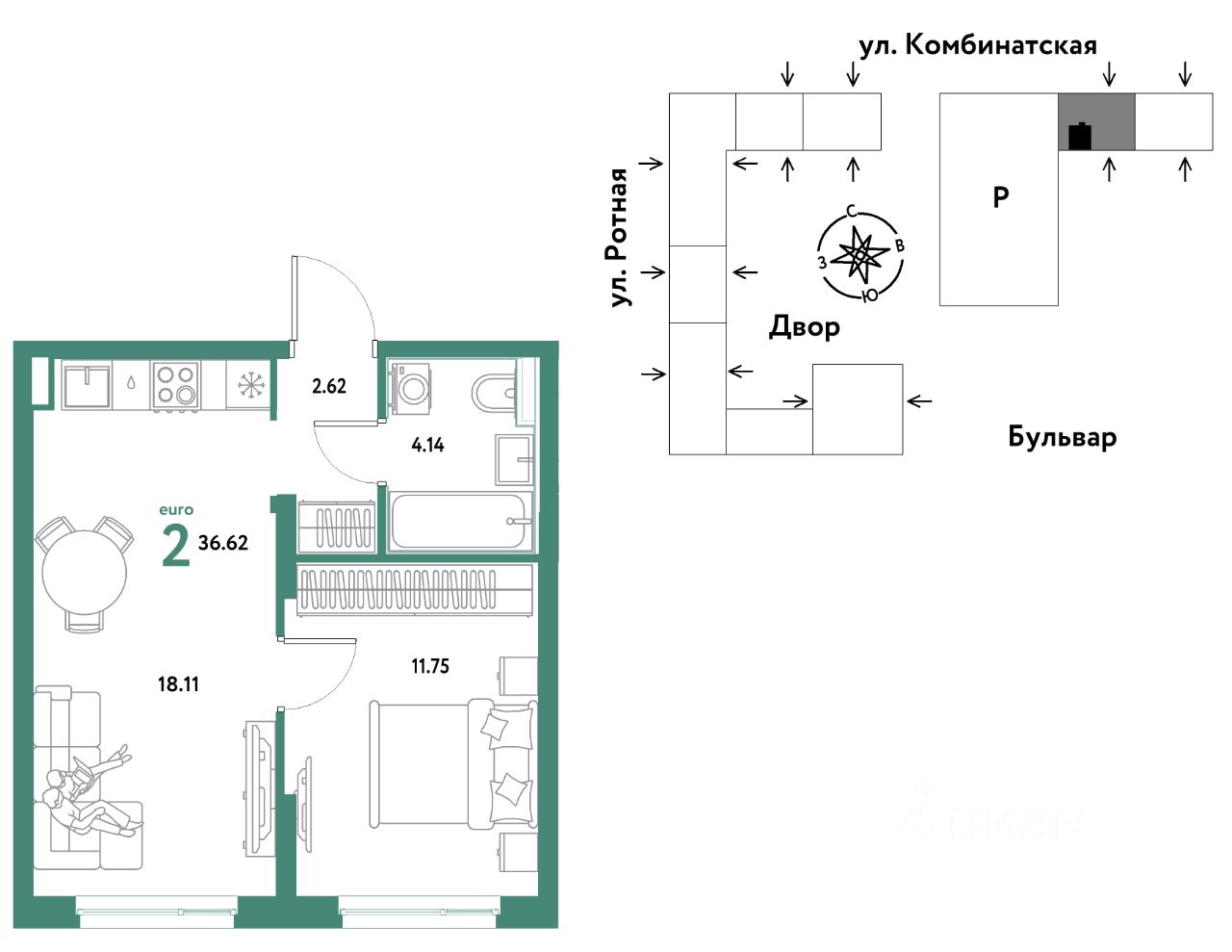 2комнатная квартира площадью 36,62кв. м. на 14 этаже жилого комплекса "Уральский сад".