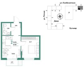 2комнатная квартира площадью 36,06кв. м. на 6 этаже жилого комплекса "Уральский сад".