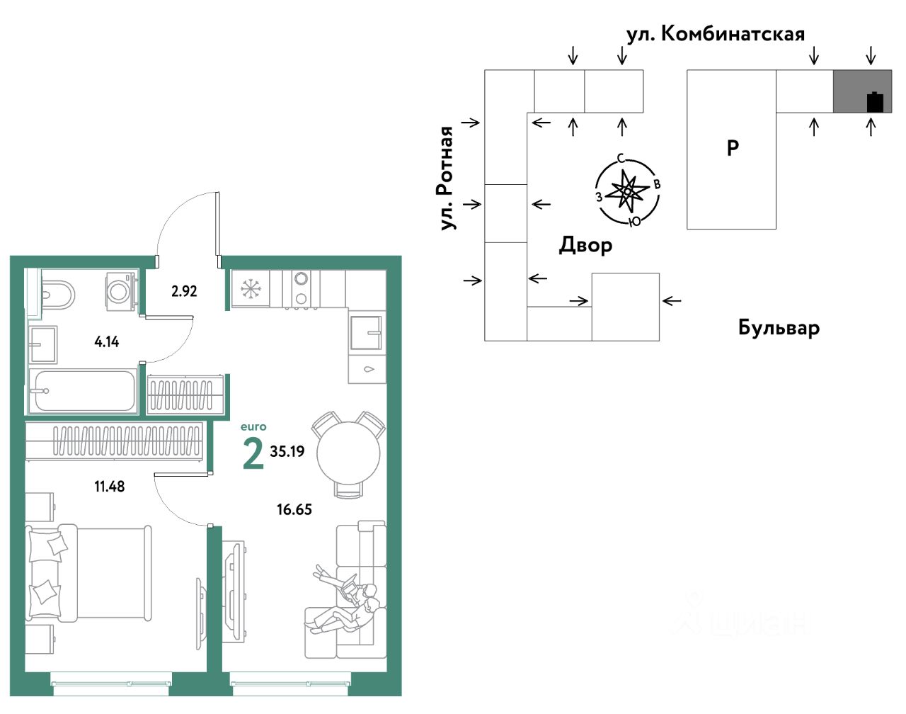 2комнатная квартира площадью 35,19кв. м. на 12 этаже жилого комплекса "Уральский сад".
