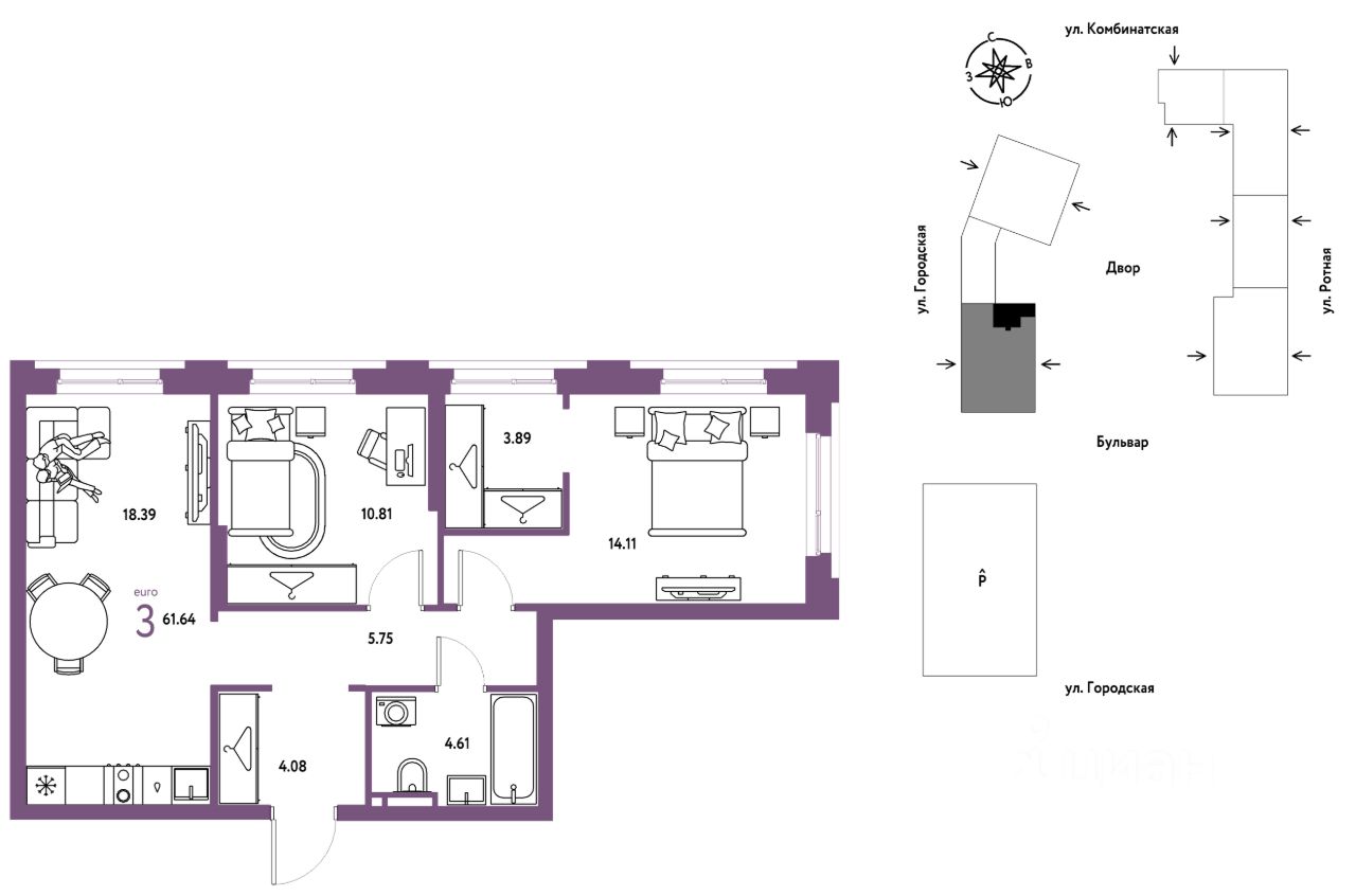 3комнатная квартира площадью 61,64кв. м. на 6 этаже жилого комплекса "Уральский сад".