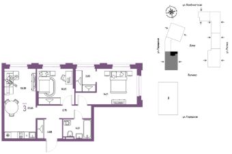 3комнатная квартира площадью 61,64кв. м. на 8 этаже жилого комплекса "Уральский сад".