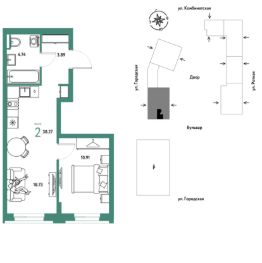 2комнатная квартира площадью 38,27кв. м. на 10 этаже жилого комплекса "Уральский сад".
