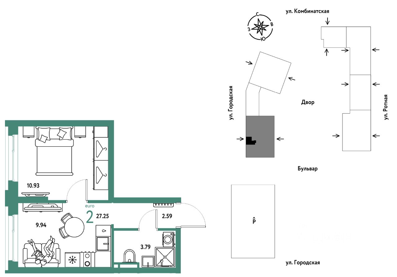 2комнатная квартира площадью 27,25кв. м. на 11 этаже жилого комплекса "Уральский сад".