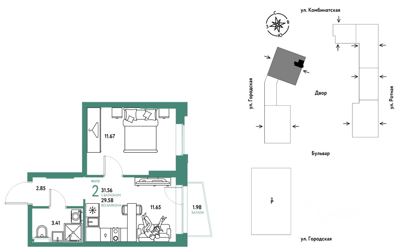 2комнатная квартира площадью 31,56кв. м. на 6 этаже жилого комплекса "Уральский сад".