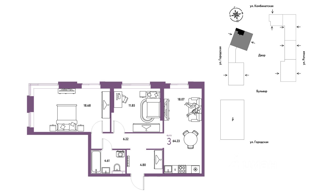 3комнатная квартира площадью 64,23кв. м. на 6 этаже жилого комплекса "Уральский сад".