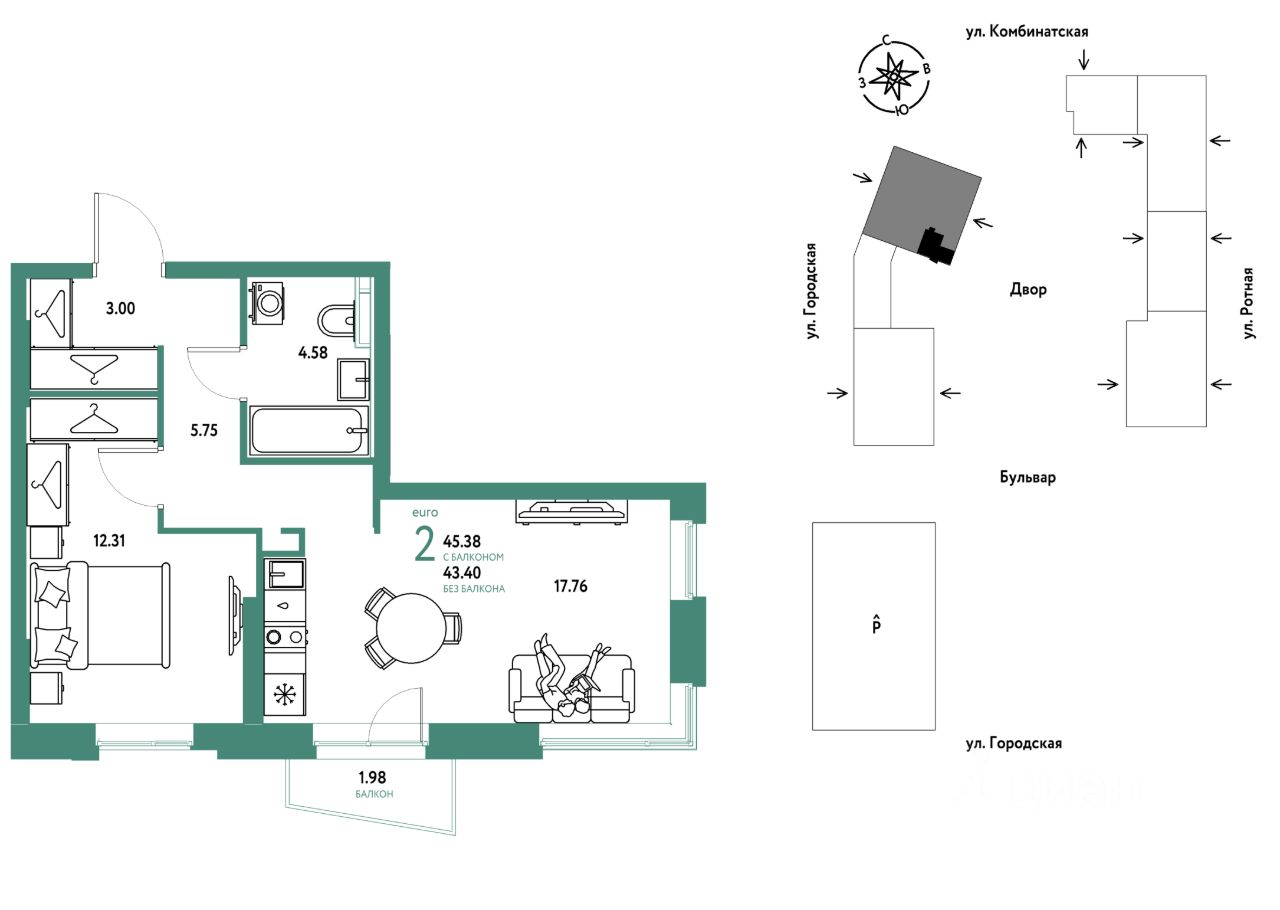 2комнатная квартира площадью 45,38кв. м. на 8 этаже жилого комплекса "Уральский сад".