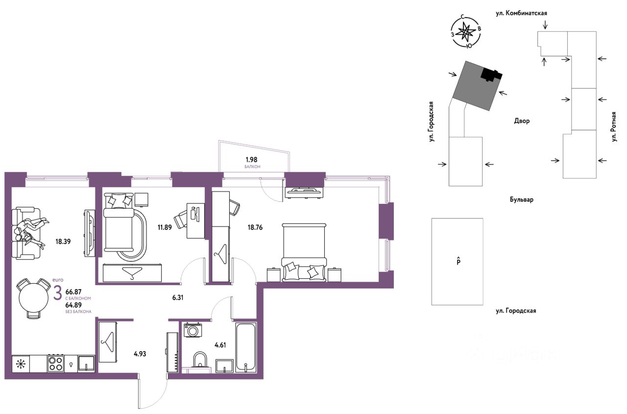 3комнатная квартира площадью 66,87кв. м. на 12 этаже жилого комплекса "Уральский сад".