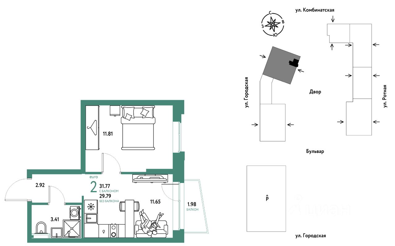 2комнатная квартира площадью 31,77кв. м. на 12 этаже жилого комплекса "Уральский сад".