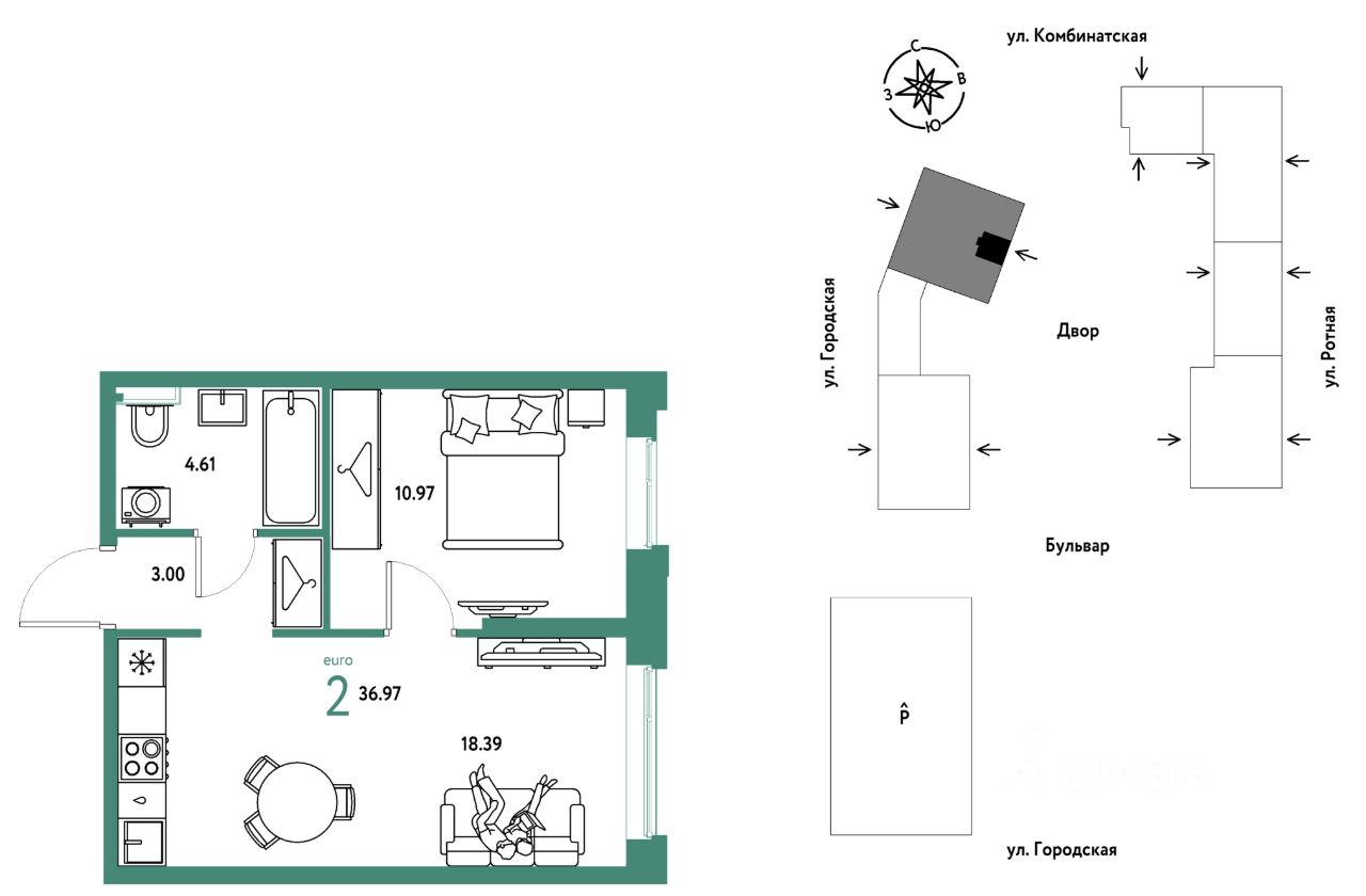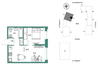 2комнатная квартира площадью 36,97кв. м. на 12 этаже жилого комплекса "Уральский сад".