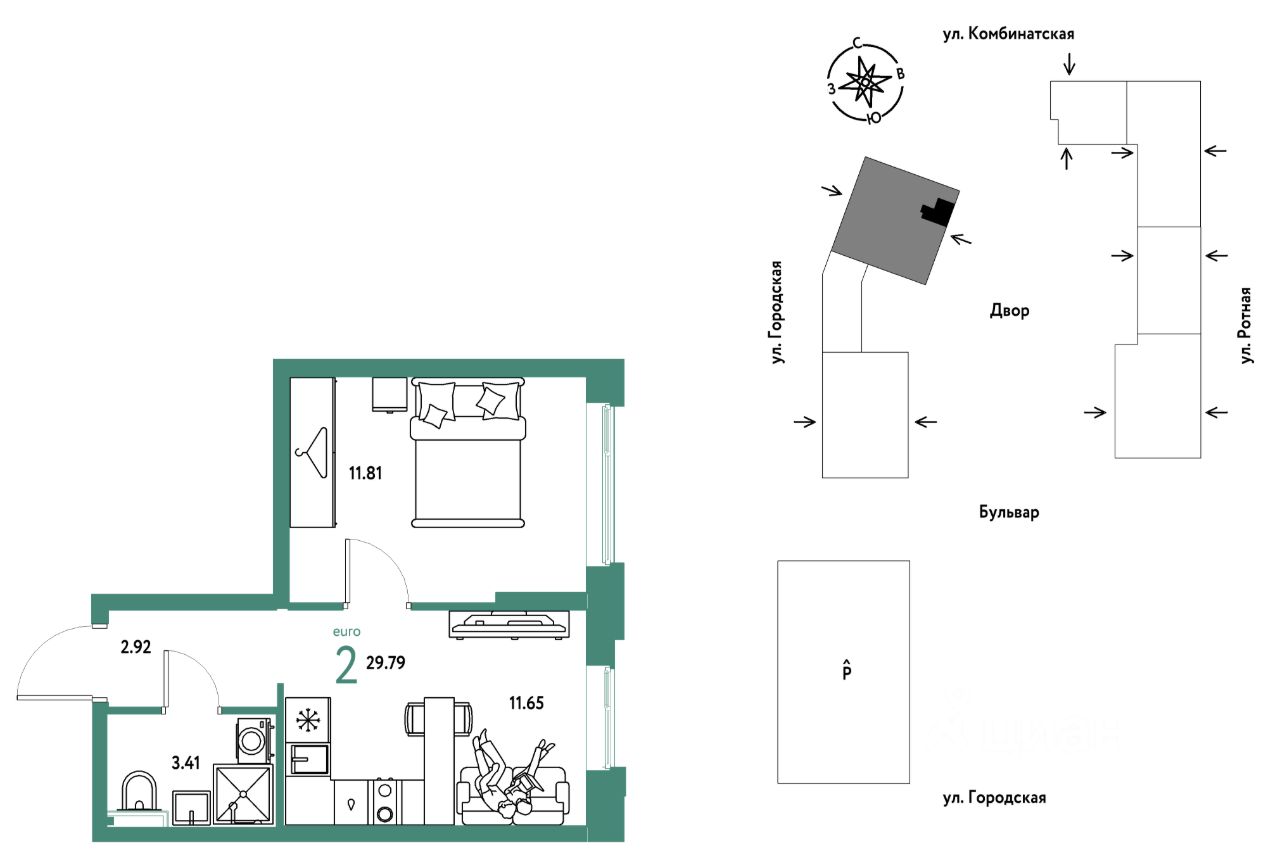 2комнатная квартира площадью 29,79кв. м. на 13 этаже жилого комплекса "Уральский сад".