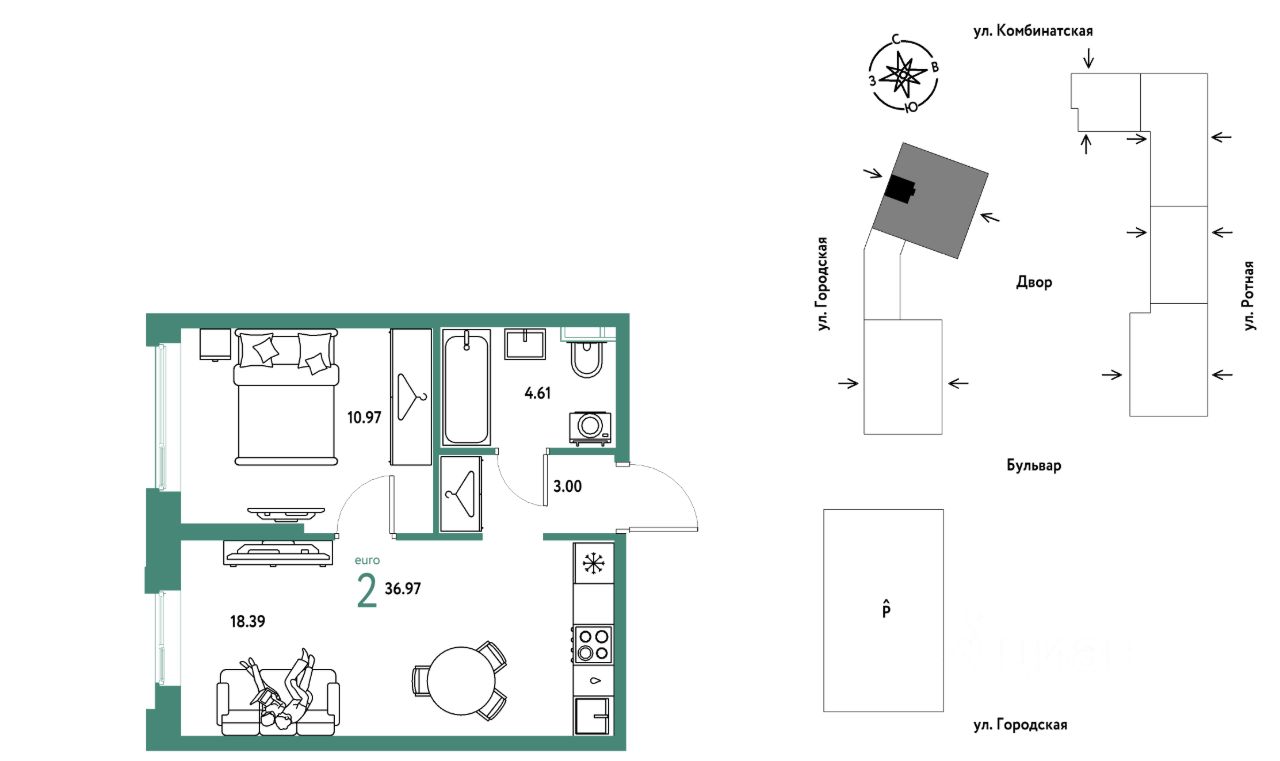 2комнатная квартира площадью 36,97кв. м. на 13 этаже жилого комплекса "Уральский сад".