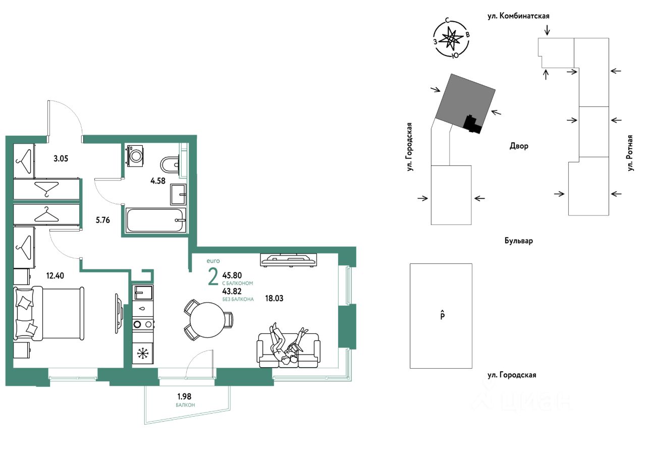 2комнатная квартира площадью 45,8кв. м. на 14 этаже жилого комплекса "Уральский сад".