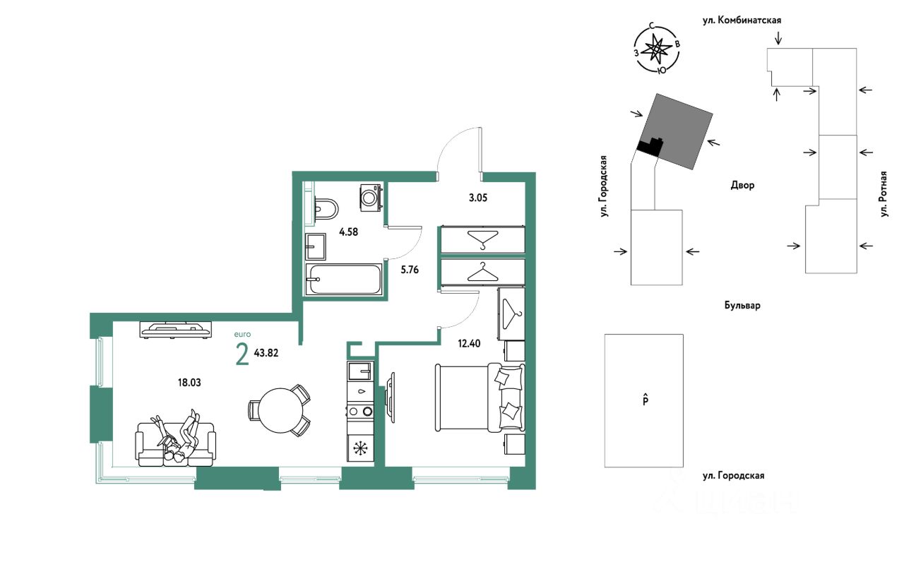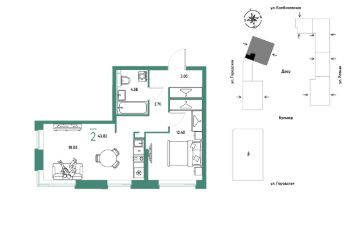 2комнатная квартира площадью 43,82кв. м. на 14 этаже жилого комплекса "Уральский сад".