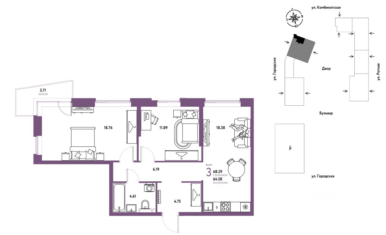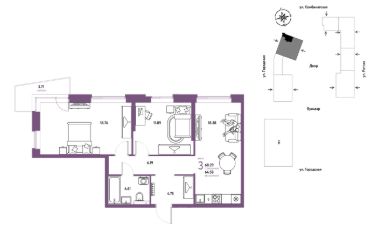 3комнатная квартира площадью 68,29кв. м. на 19 этаже жилого комплекса "Уральский сад".