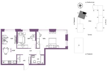 3комнатная квартира площадью 64,89кв. м. на 20 этаже жилого комплекса "Уральский сад".