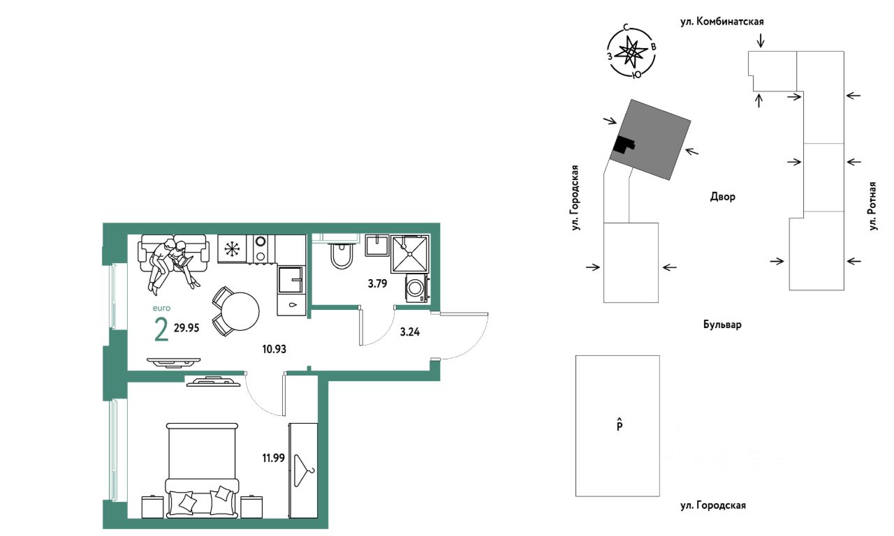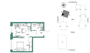 2комнатная квартира площадью 29,95кв. м. на 20 этаже жилого комплекса "Уральский сад".