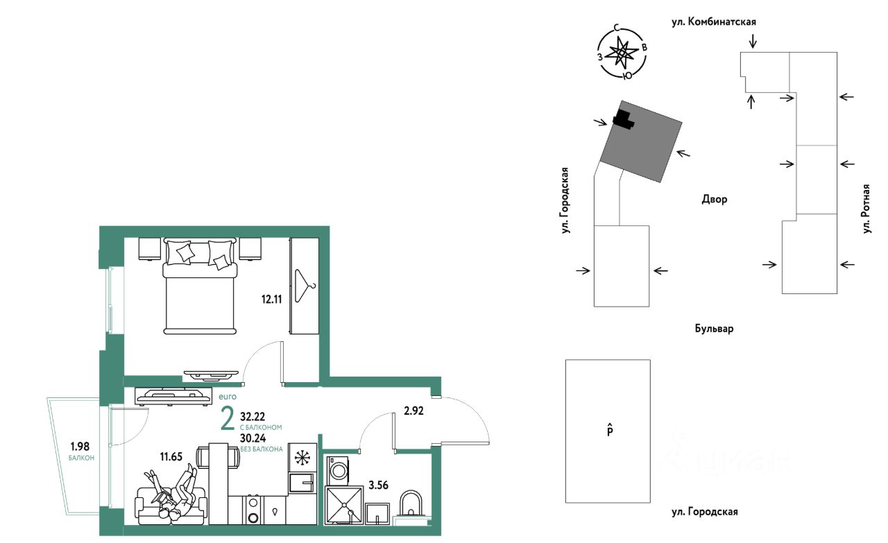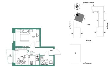 2комнатная квартира площадью 32,22кв. м. на 20 этаже жилого комплекса "Уральский сад".