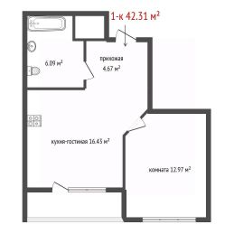 Площадь кухни - 16,4 м2 , жилой комнаты 13 м2, санузел 6 м2. С такой планировкой можно расположить все самое необходимое и при этом останется свободное место.