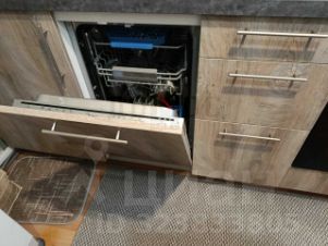 Комфорт: Современный кухонный гарнитур от "Леруа Мерлен" с качественной фурнитурой и с встроенной техникой: варочная панель, духовой шкаф вытяжка и посудомоечная машина, застеклен пластиком балкон