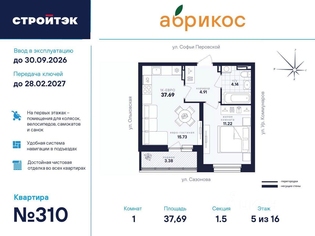 ЖК "Абрикос" ЖК "Абрикос", расположен в районе Новая Сортировка по адресу ул. Софьи Перовской, д. 106а. Познакомьтесь с "Абрикосом" поближе. Мы создали его таким, чтобы вы были довольны всем, а ваша жизнь в нём была как сам этот фрукт: свежей, сочной, яркой и солнечной. Район Тихий микрорайон Новая сортировка на Северо-западе Екатеринбурга. 20 минут пешком до парка "Таганская слобода" 15 минут на машине до кольцевой дороги, а до центра — полчаса даже по пробкам 10 минут на машине до ТЦ "Карнавал" 7 школ и 11 детсадов поблизости 6 продуктовых магазинов рядом Двор Во дворе хорошо должно быть всем: детям — площадки по возрасту, взрослым — прогулочные дорожки. Но это не всё. Вместительная парковка вокруг ЖК Концепция "Двор без машин", когда можно заехать только для разгрузки и погрузки Закрытая территория с пропускной системой Круглосуточное видеонаблюдение и освещение территории в ночное время Стритбольная площадка Подъезды Не подъезд, а парадная. Так говорят в Петербурге, но и в "Абрикосе" это слово приходит в голову. Просторные холлы с витражами и достойной отделкой. Доступ в подъезды на уровне земли — без барьеров Домофоны — в тёплых остеклённых тамбурах В каждом подъезде — грузопассажирский лифт Помещения для колясок и самокатов на 1 этаже Удобная навигация с номерами этажей и квартир Планировки Наш подход к проектированию называется "Разумные метры". Это значит не только исходить из площади, но и учитывать число жильцов и их потребности. Объединённые кухни-гостиные для простора и общения 3D-модели с вариантами обстановки Отказ от бесполезных "мёртвых" зон Отделка В ЖК "Абрикос" мы позаботились о чистовой отделке, чтобы ваш переезд прошёл быстро и не вызвал лишних хлопот. На полу в комнатах, прихожих и кухнях — прочный водостойкий ламинат, в санузлах — керамическая плитка, потолки — натяжные Межкомнатные двери и усиленная сейф-дверь на входе в квартиру В санузлах установлены раковины и унитазы, а во всей квартире — розетки и выключатели Радиаторы с терморегуляторами и горизонтальной разводкой, двухкамерные стеклопакеты с приточными клапанами вентиляции