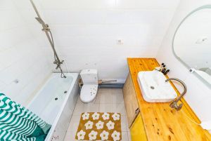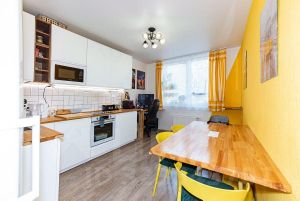 В стоимость квартиры входит: кухонный гарнитур с раковиной и смесителем, холодильник; туалетная комната: раковина с тумбой, зеркало, унитаз; ванная, раковина и стиральная машинка.