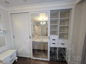 Скрытая фальш-дверь в гардеробную, система хранения через встроенные шкафы-купе.