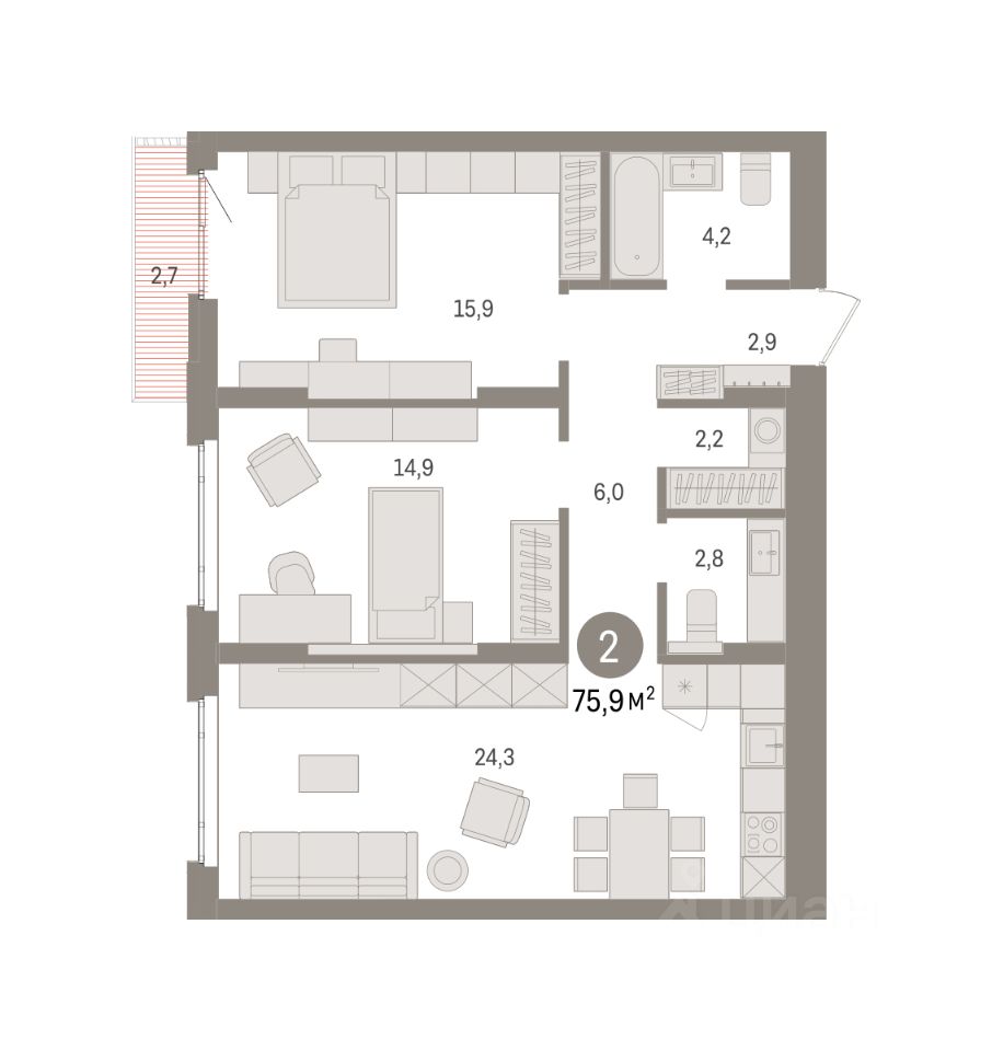 Квартира с кухней-гостиной и двумя спальнями в квартале "Траектория". Особенности планировки: второй санузел, гардеробная, вид во двор, разнесённые спальни, предчистовая отделка, балкон.