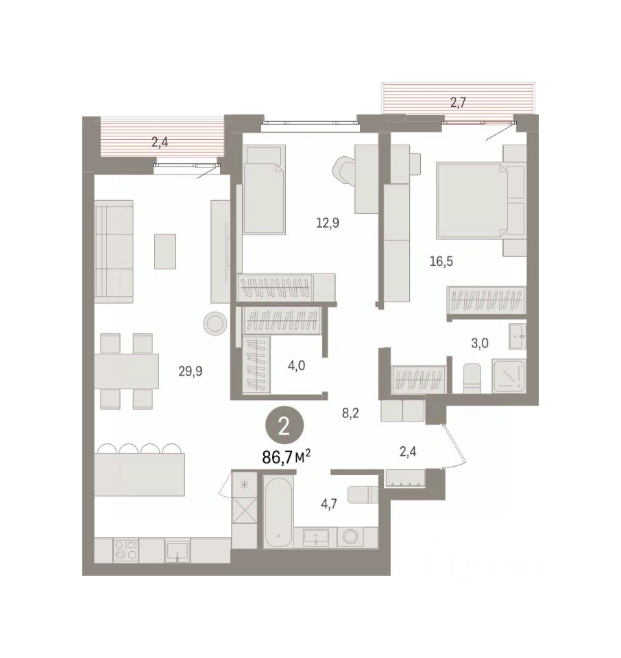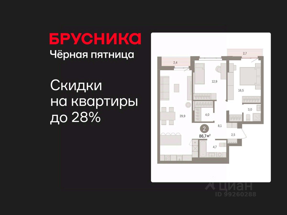 Продается 2-комн. квартира от застройщика с предчистовой отделкой в ЖК "Квартал Траектория" на 5 этаже. Общая площадь: 86.7 кв.м., жилая: 29.4 кв.м., площадь просторной кухни-столовой: 29.9 кв.м. Комнаты изолированные, все окна выходят на одну сторону. В квартире один балкон и одна лоджия, два совмещенных санузла. Высота потолков 2.82 м.