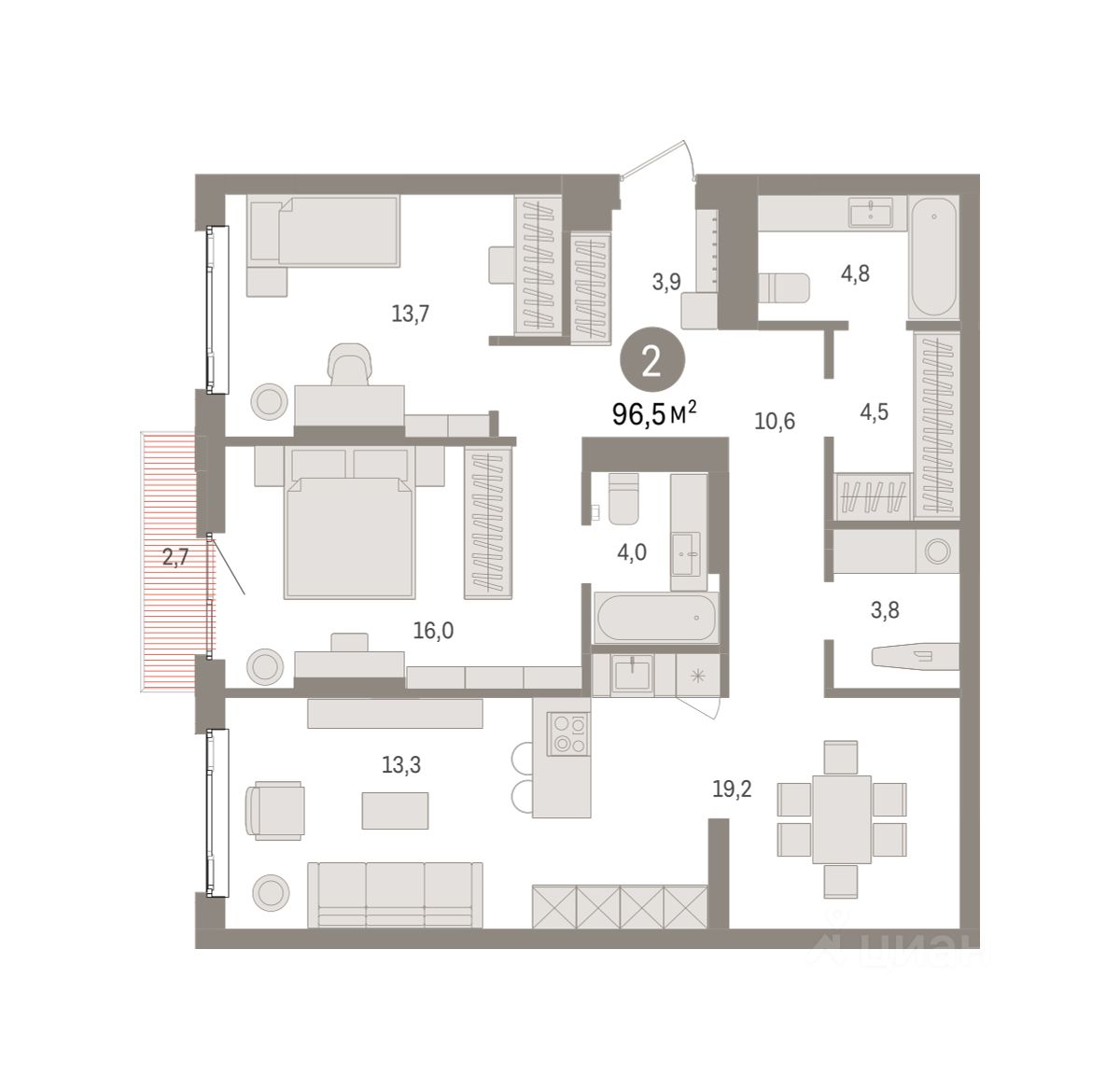 2-комн. квартира от застройщика с предчистовой отделкой в ЖК "Квартал Траектория" на 6 этаже. Общая площадь: 96.5 кв.м., жилая: 29.7 кв.м., площадь просторной кухни-столовой: 32.4 кв.м. Комнаты изолированные, все окна выходят на одну сторону. В квартире один балкон, два совмещенных санузла. Высота потолков 2.82 м.