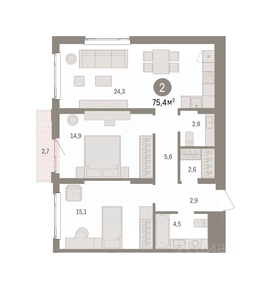 Квартира с кухней-гостиной и двумя спальнями в квартале "Траектория". Особенности планировки: второй санузел, гардеробная, вид во двор, разнесённые спальни, предчистовая отделка, балкон.