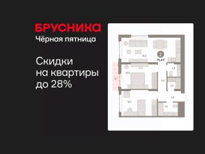 Двухкомнатная квартира с предчистовой отделкой в ЖК "Квартал Траектория" на 9 этаже. Общая площадь: 75.4 кв.м. Высота потолков 2.82 м.
