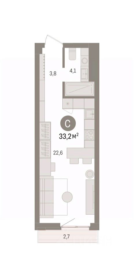 1-комн. студия с предчистовой отделкой в ЖК "Квартал Траектория" на 10 этаже. Общая площадь: 33.2 кв.м. Высота потолков 2.82 м.