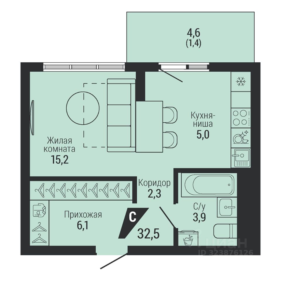 Общая площадь33,9 м²
