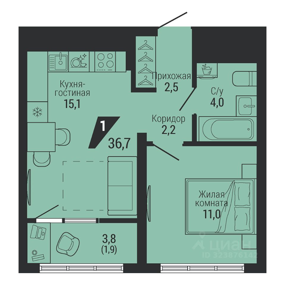Общая площадь36,7 м²