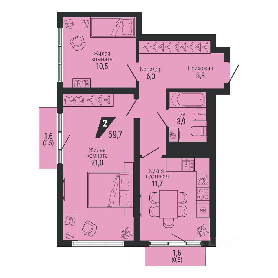 Общая площадь59,7 м²