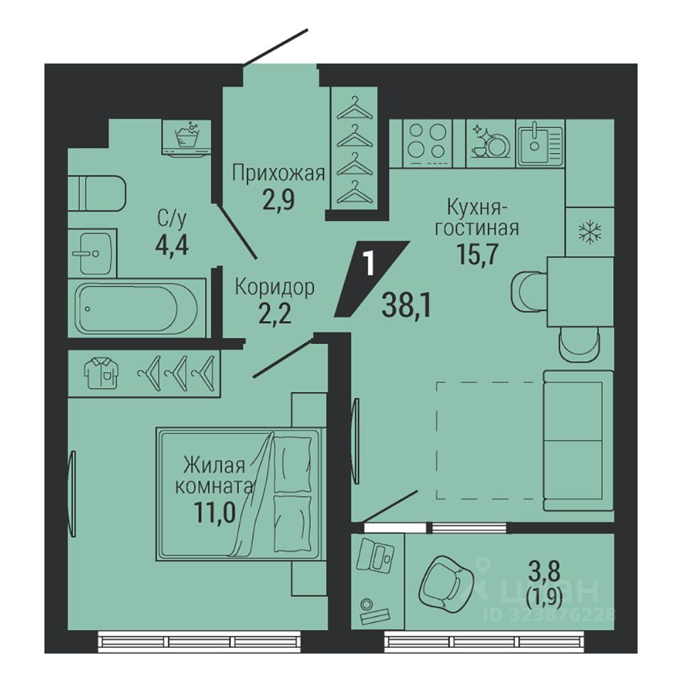 Общая площадь38,1 м²