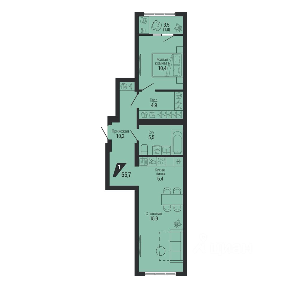 Общая площадь55,1 м²