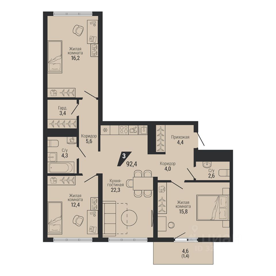 Общая площадь92,4 м²