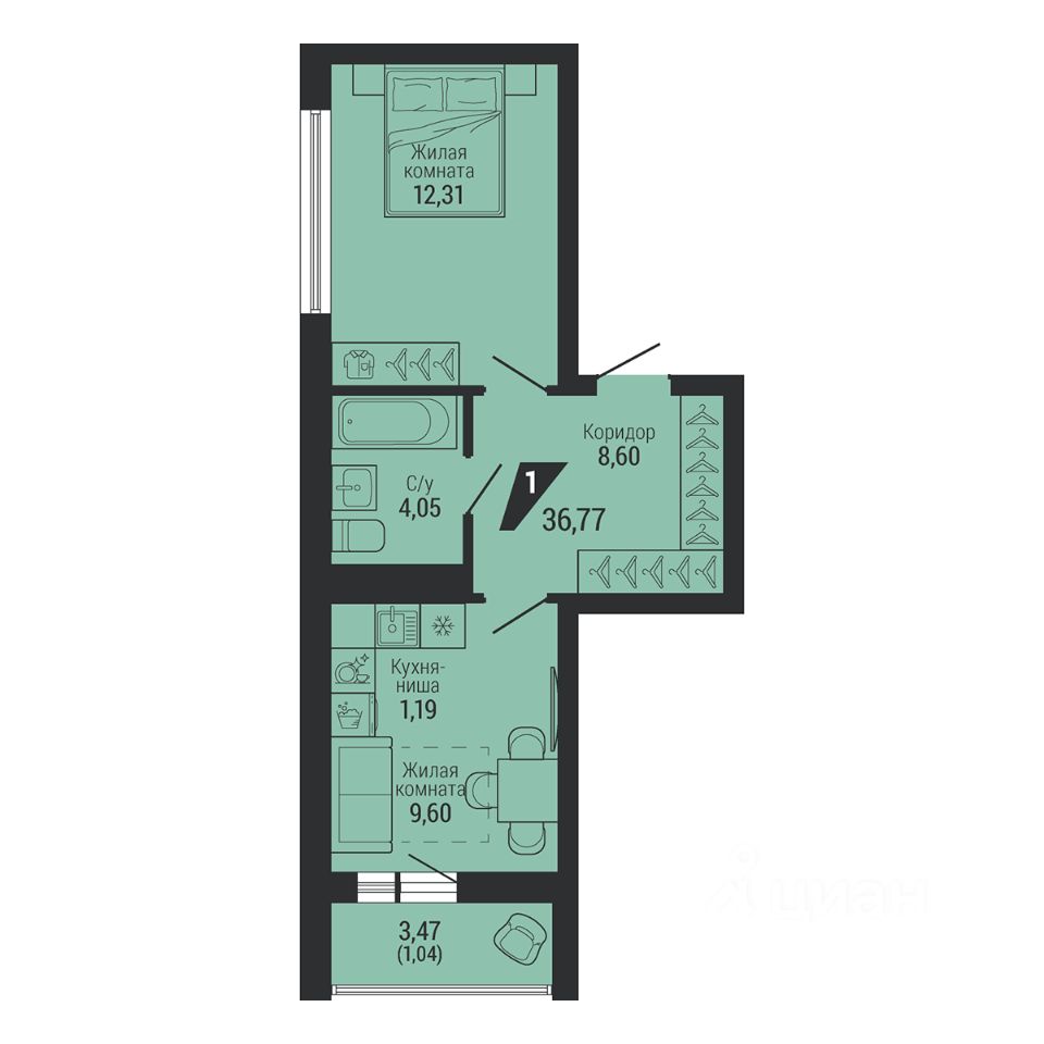Общая площадь36,75 м²