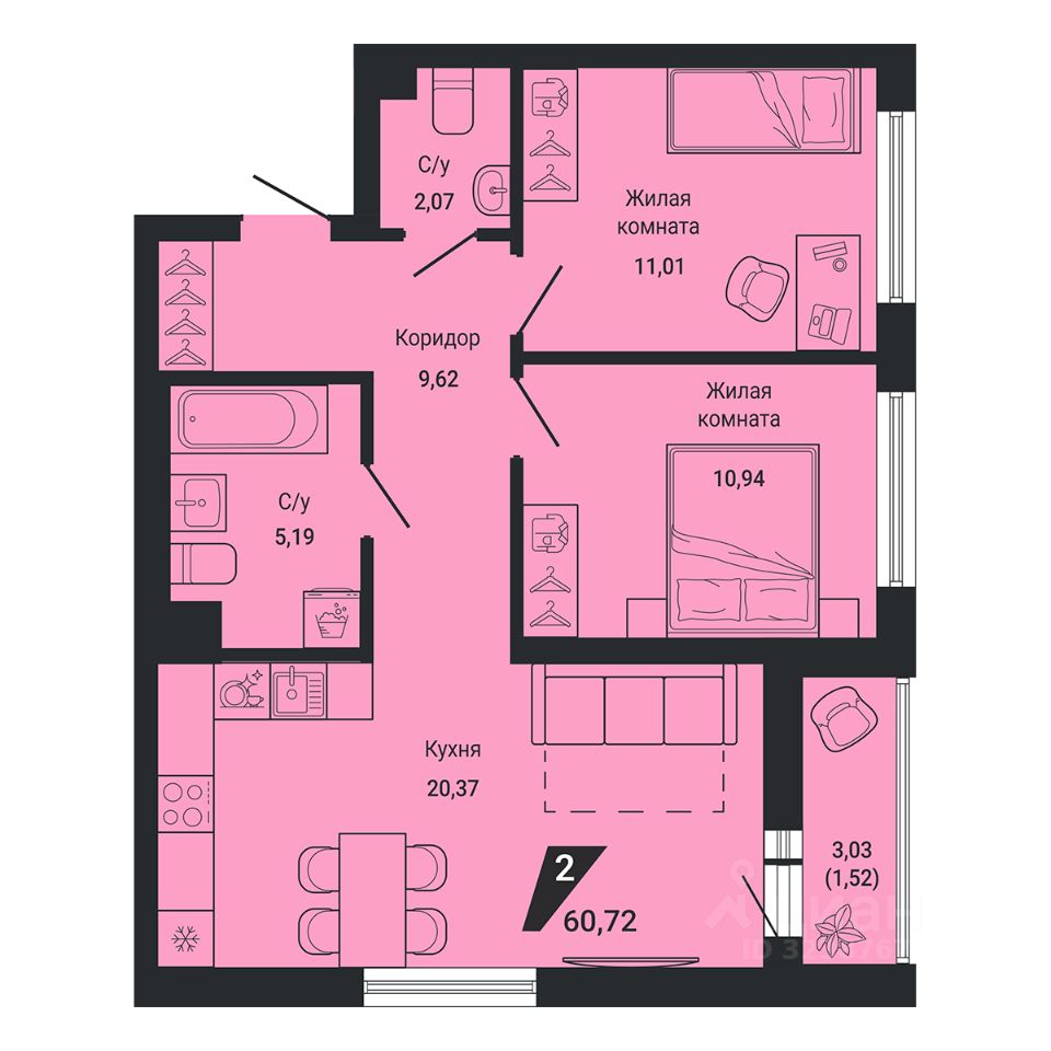 Общая площадь60,72 м²