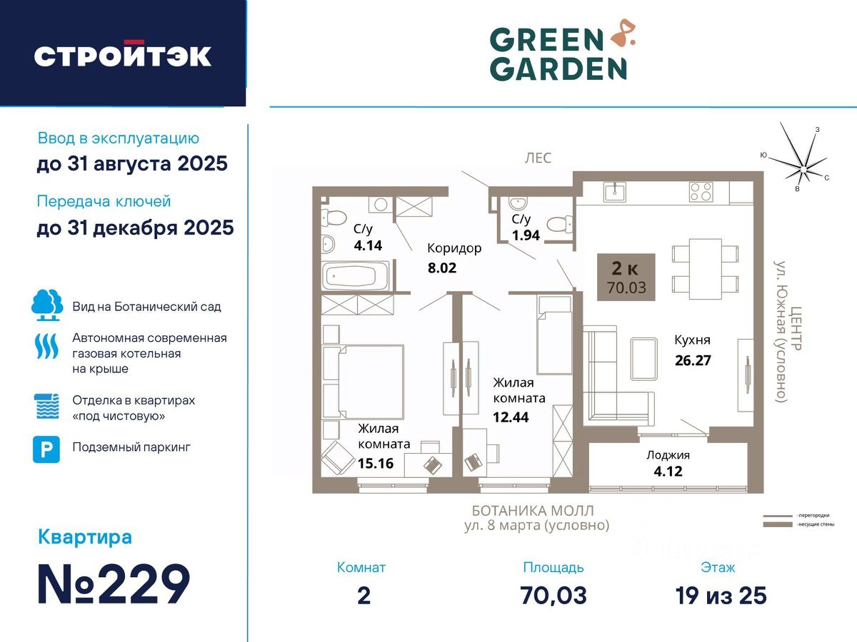 Жилой комплекс Green Garden (Грин Гарден) расположен в микрорайоне Ботанический, в сердце Ботанического сада — по адресу 8 марта, 204е. Дом сдан. Продажа квартир осуществляется по договору купли-продажи от застройщика. Район Экологичный Ботанический микрорайон — один из самых молодых, и при этом развитых в городе. 100-летний Ботанический сад — прямо у дома 5 минут пешком до остановки транспорта 8 минут пешком до "Ботаники Молл" 10 минут на машине до центра города 2 км через парк — до метро "Ботаническая" 6 школ и 7 детсада поблизости Двор Кроме привычных элементов окружения, у дома — современная автономная газовая котельная на крыше — независимая, экономичная и безопасная. Концепция "Двор без машин", когда можно заехать только для разгрузки и погрузки Закрытая и освещённая территория без посторонних Круглосуточное видеонаблюдение Собственный сад с деревьями и кустарниками Детские и спортивные площадки, места для отдыха и мероприятий Подземный паркинг на 114 мест Подъезды Богатое и утончённое оформление холлов, удобная мягкая мебель, информативная навигация, стойка ресепшн и радушный консьерж. И это — не всё. Доступ в подъезд на уровне земли — без барьеров Домофон в тёплом остеклённом тамбуре 4 лифта, 2 из которых — грузовые Помещения для колясок и самокатов на 1 этаже Комната гигиены, чтобы помыть руки или лапы Планировки Обратите внимание на варианты с тёплыми лоджиями панорамного остекления, а также с террасами на первом этаже. В остальном — наш золотой стандарт — подход "Разумные метры". Объединённые кухни-гостиные для простора и общения Отказ от бесполезных зон Отделка В Green Garden (Грин Гарден) мы предоставили вам свободу для творчества и выполнили отделку "под чистовую". На полу цементно-песчаная стяжка, на стенах — штукатурка, на потолках балконов — краска Усиленная сейф-дверь на входе в квартиру, на балконах и лоджиях — остекление В санузлах установлены унитазы, раковины и смесители, а во всей квартире — розетки и выключатели Радиаторы с терморегуляторами и горизонтальной разводкой Естественная вытяжка с механическим побуждением Двухкамерные стеклопакеты с приточными клапанами вентиляции Телеметрические счётчики на свет, тепло и воду