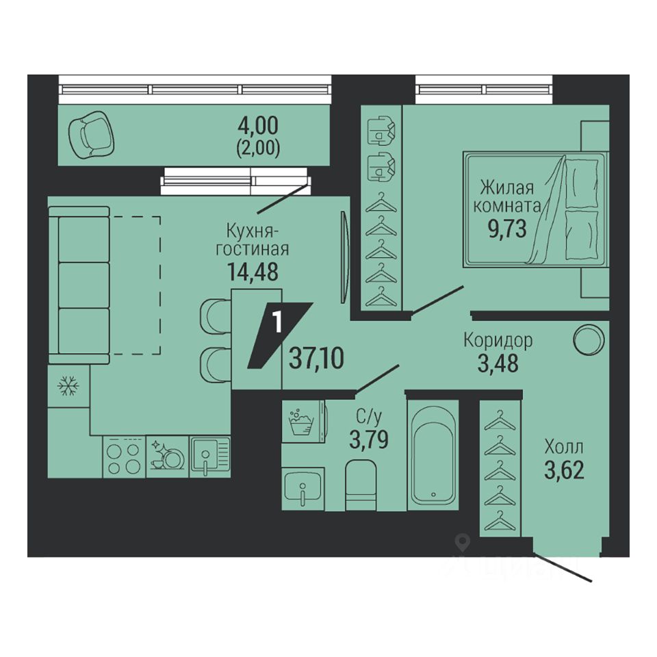Общая площадь37,1 м²