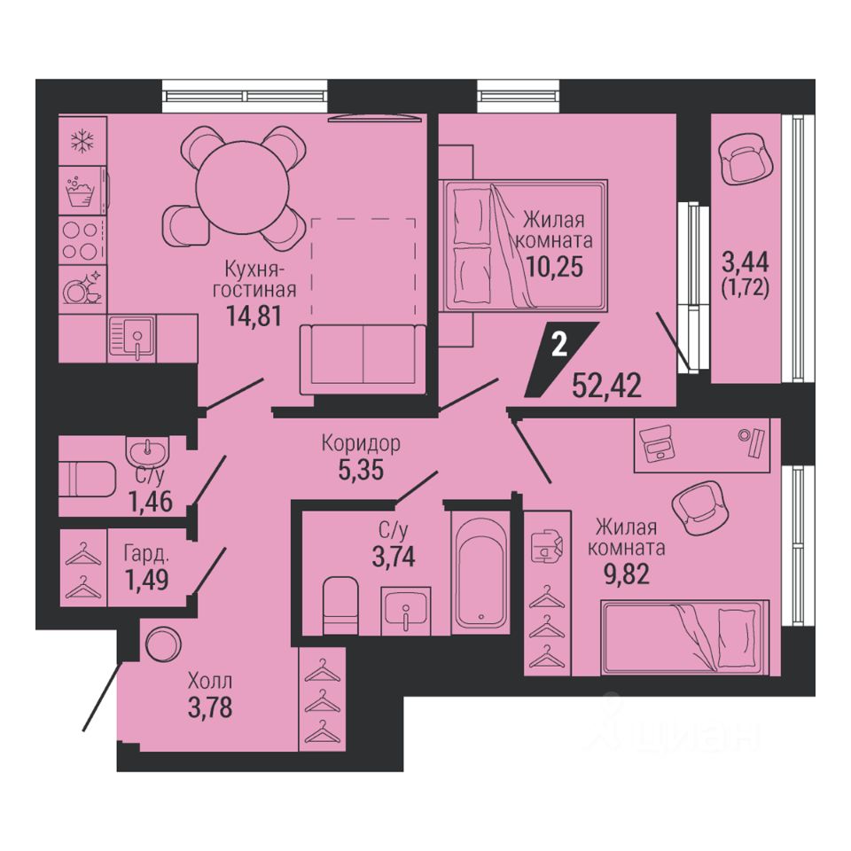 Общая площадь52,42 м²