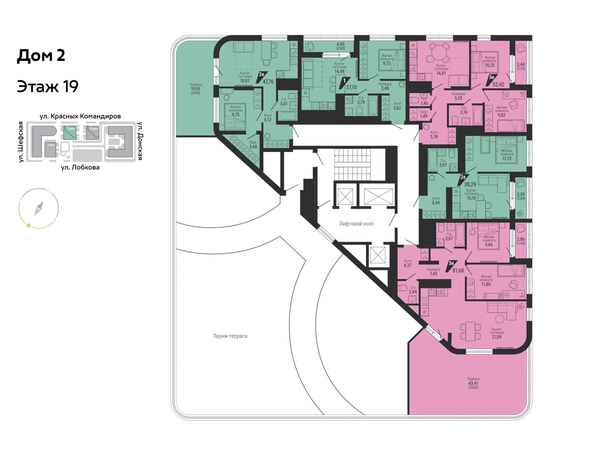 На этаже располагается от четырех квартир, площади от 27 до 81 кв. м. Есть евро и классические планировки, а таже квартиры с личными террасами. Кухни-гостиные становятся местом сбора всей семьи, мастер-спальни располагаются в стороне от детских. В больших квартирах предусмотрено несколько санузлов и гардеробные. Во всех планировках второй очереди есть лоджии, где можно обустроить дополнительные зоны для работы или отдыха.