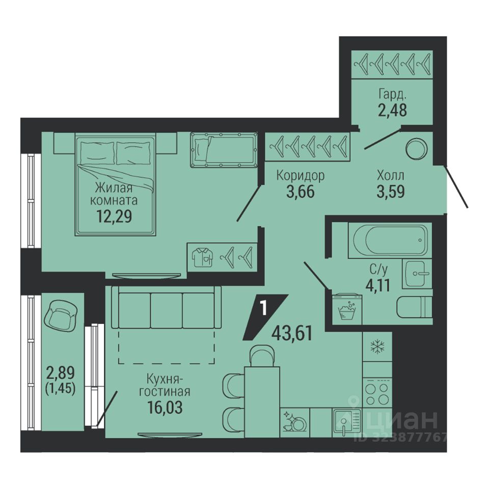 Общая площадь43,61 м²