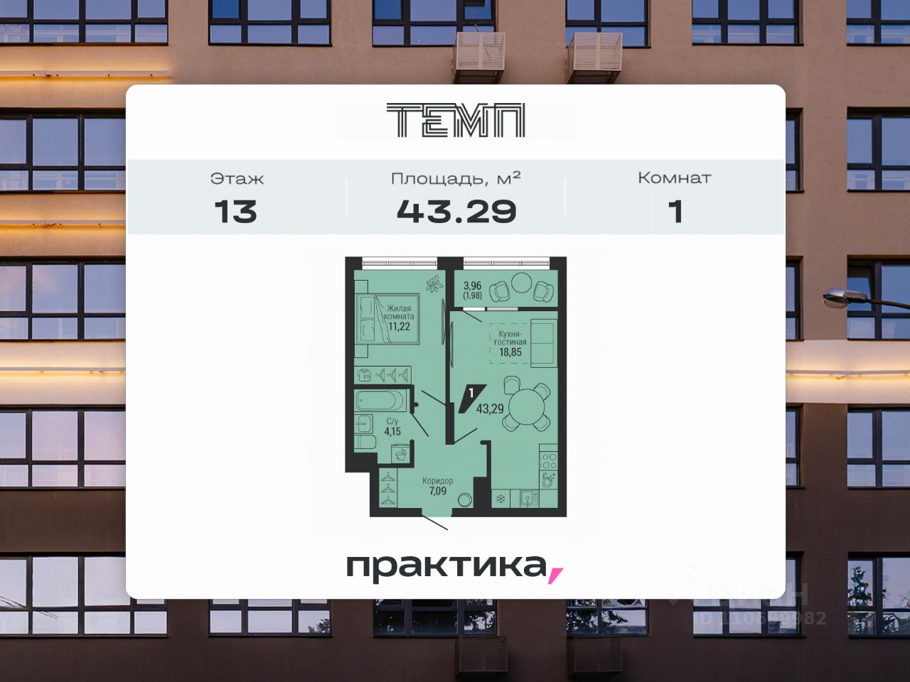 Общая площадь43,29 м²