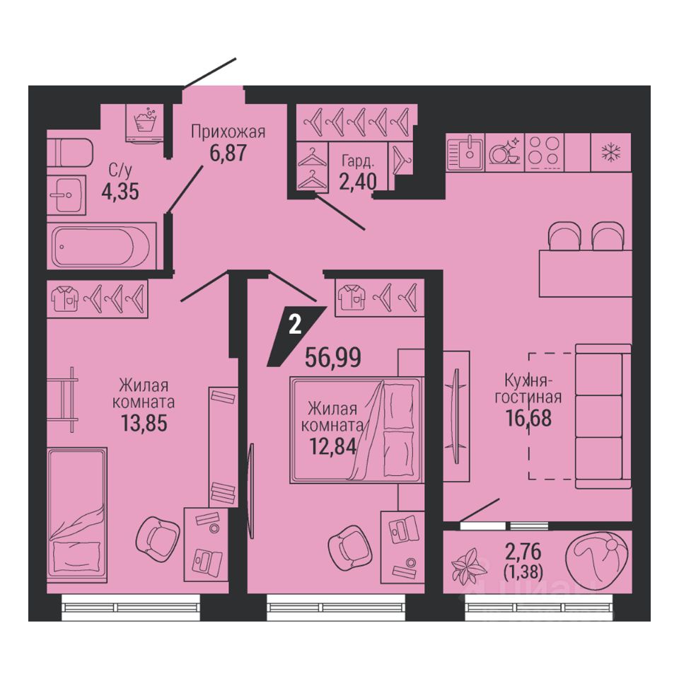 Общая площадь58,37 м²