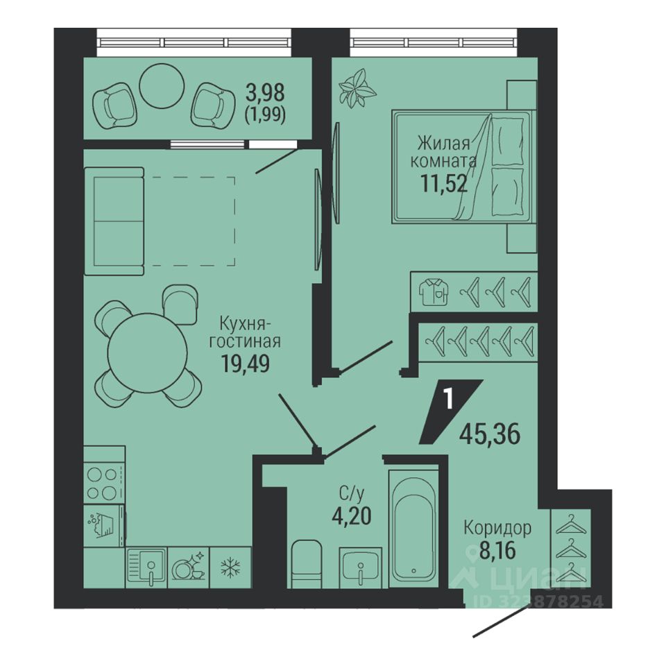 Общая площадь45,36 м²
