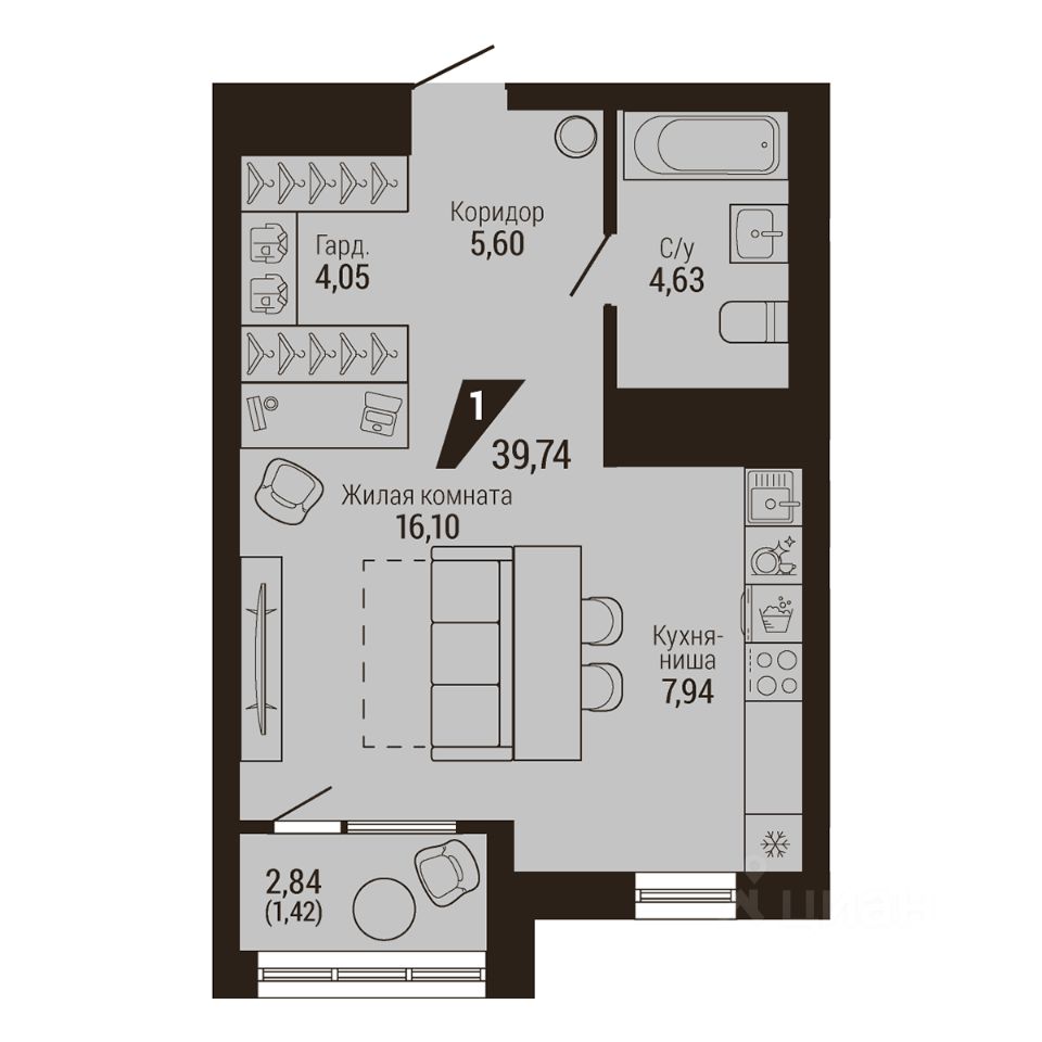 Общая площадь39,74 м²