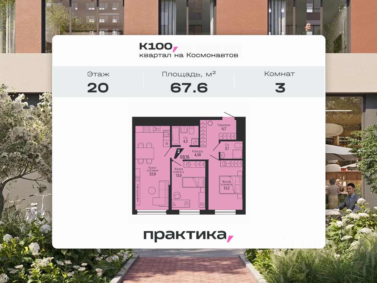 Жилой квартал "К100" на Космонавтов, 100 будет состоять из трех монолитно-кирпичных домов, объединенных общим двором. Застройщик компания "Практика". Планировки начинаются от 44,8 м² и доходят до 159,5 м². На каждом этаже располагается от восьми квартир классического и евроформата от двух до пяти комнат. Застройщик предлагает два вида отделки: white box и чистовую. Есть возможность перепланировки. Двор с ландшафтным озеленением разделен на три зоны. Для детей игровые площадки с меловыми досками и уличными шахматами, для взрослых лаунж-зона с креслами и столиками для отдыха, для спортсменов воркаут-площадка. На первом этаже лобби-клуб с игровыми комнатами, залом для йоги, коворкингом и мини-кинотеатром, колясочные и велосипедные помещения. Для автомобилистов предусмотрены гостевые места и подземный паркинг с доступом на лифте. На всей территории жилого комплекса установят видеонаблюдение. В доме будет работать консьерж-сервис в режиме 24/7. Дополнительные услуги включают клининг, выгул домашних животных, доставку еды из ресторанов и вызов такси. Также предусмотрена система "Умный дом". Рядом с жилым комплексом находятся сосновый бор, школы, детские сады, медицинские учреждения, торговые центры и супермаркеты, остановки общественного транспорта и станция метро. В шаговой доступности от дома откроется новый корпус уникальной гимназии "Арт-Этюд" — многопрофильного центра общего и художественного образования для детей от 3 до 18 лет. Строительство первой очереди жилого квартала "К100" на Космонавтов, 100 завершится в четвертом квартале 2026 года.